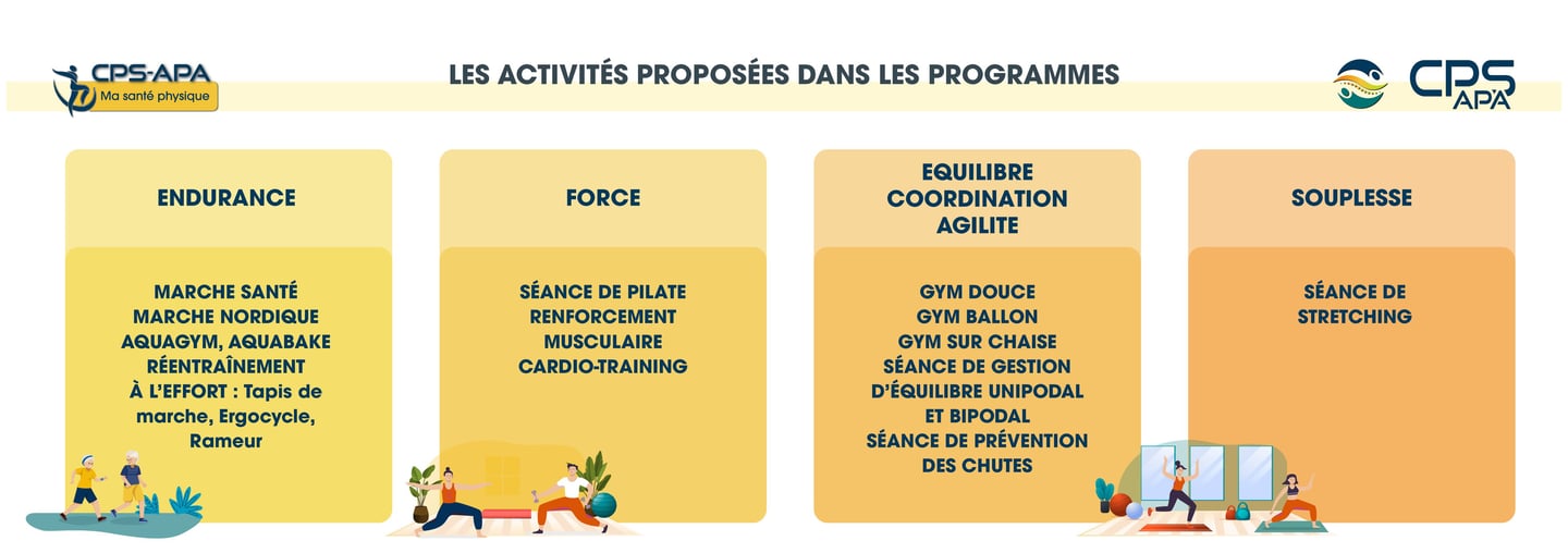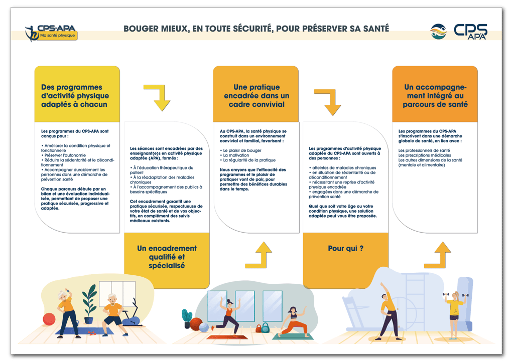 Au CPS-APA, il n’existe pas un programme standard, mais plusieurs parcours d’activité physique adaptée, conçus pour répondre à des besoins spécifiques, tout en partageant une même exigence de qualité, de sécurité et de coordination.