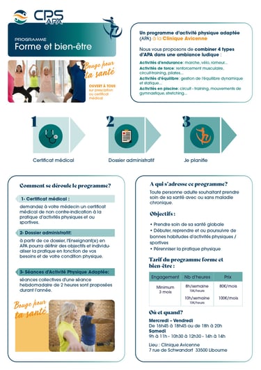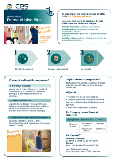 Ce programme s’adresse aux personnes engagées dans un parcours d’activité physique adaptée au CPS-APA et souhaitant :